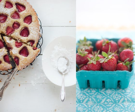 5. Coloque a massa numa forma untada com manteiga e arrume os morangos por cima, um do ladinho do outro com o lado cortado voltado para cima. Polvilhe as duas colheres de açucar sobre os eles.